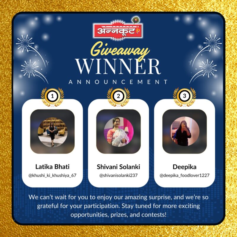 Annkoot Agro Food Pvt. Ltd. recently organized an exciting giveaway on its social media platform to engage with its community and spread festive cheer! ๐๐พ As part of this special event, the company selected three lucky winners โ Latika Bhati, Shivani Solanki, and Deepika โ who will each be receiving exclusive gifts. ๐๐