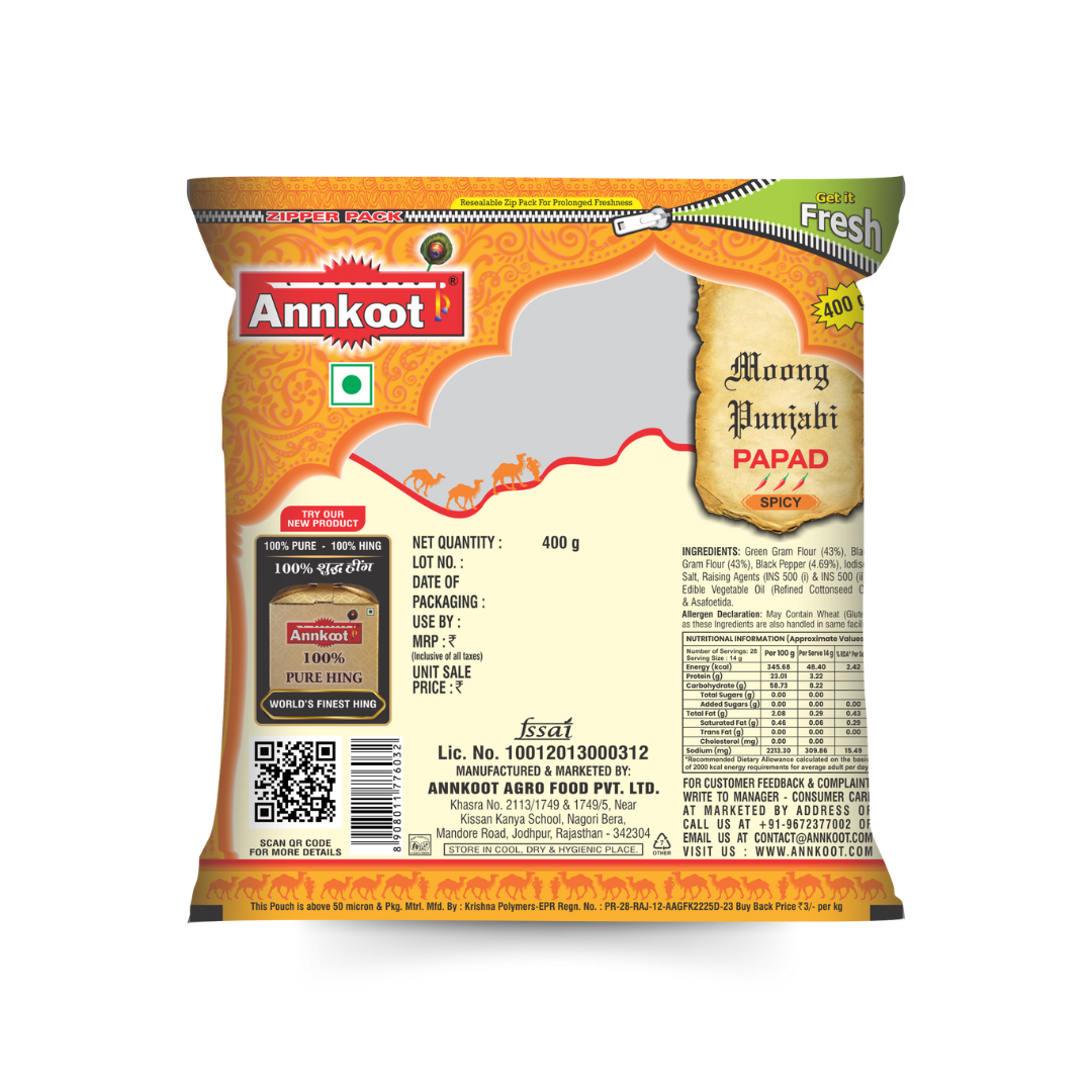 Annkoot Moong Punjabi Papad is a delightful blend of tradition and flavor, handcrafted with love to bring you the authentic taste of Punjab. Every bite delivers an irresistible crunch, complemented by a rich aroma of roasted moong dal and handpicked spices. Made with pure, high-quality ingredients, it carries the warmth of a mother?s love, ensuring a homely touch in every crisp bite. The traditional handmade technique preserves its authentic texture and taste, making it the perfect accompaniment to any meal or a delicious snack on its own.