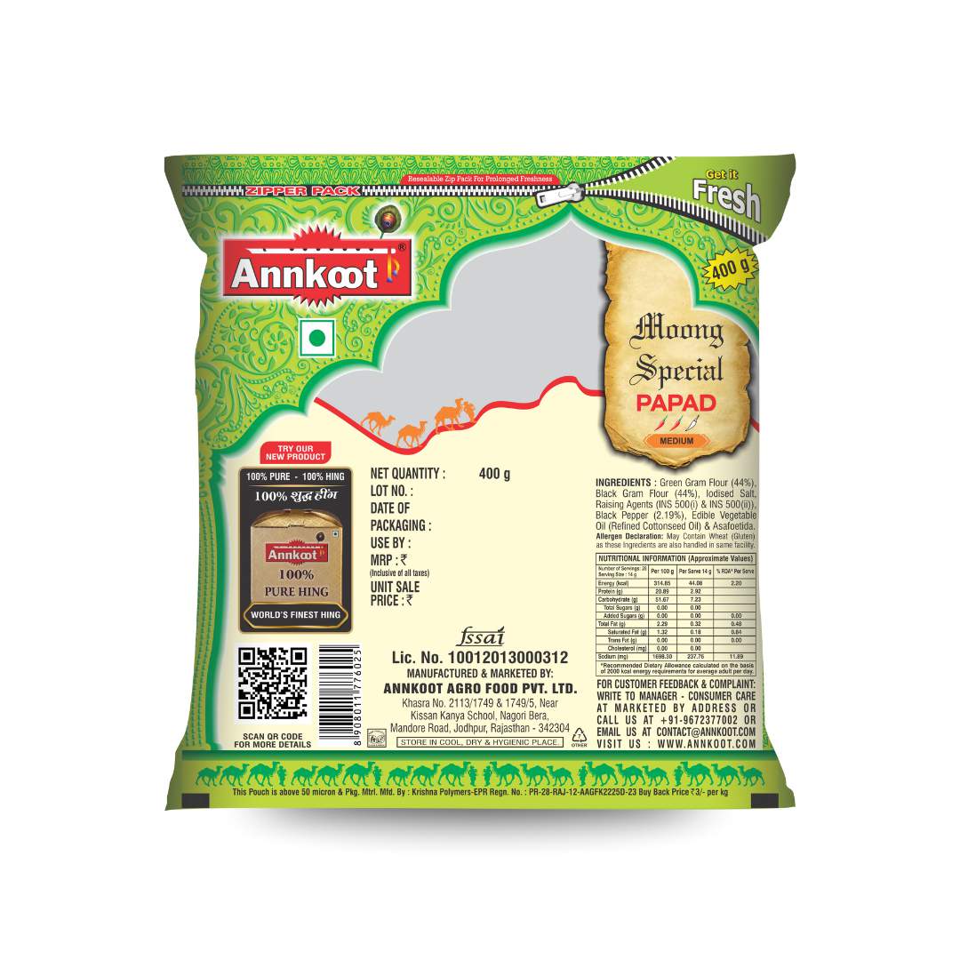 Annkoot Moong Special Papad is a delightful blend of tradition and taste, handcrafted with love to bring you the authentic flavors of home. Made from the finest moong dal, it boasts a light, crispy texture that delivers an irresistible crunch in every bite. The rich aroma of carefully selected spices enhances its savory goodness, making it a perfect accompaniment to any meal. Prepared using traditional handmade techniques and pure ingredients, this papad carries the warmth of a mother’s love, ensuring every bite is wholesome, delicious, and true to its roots.