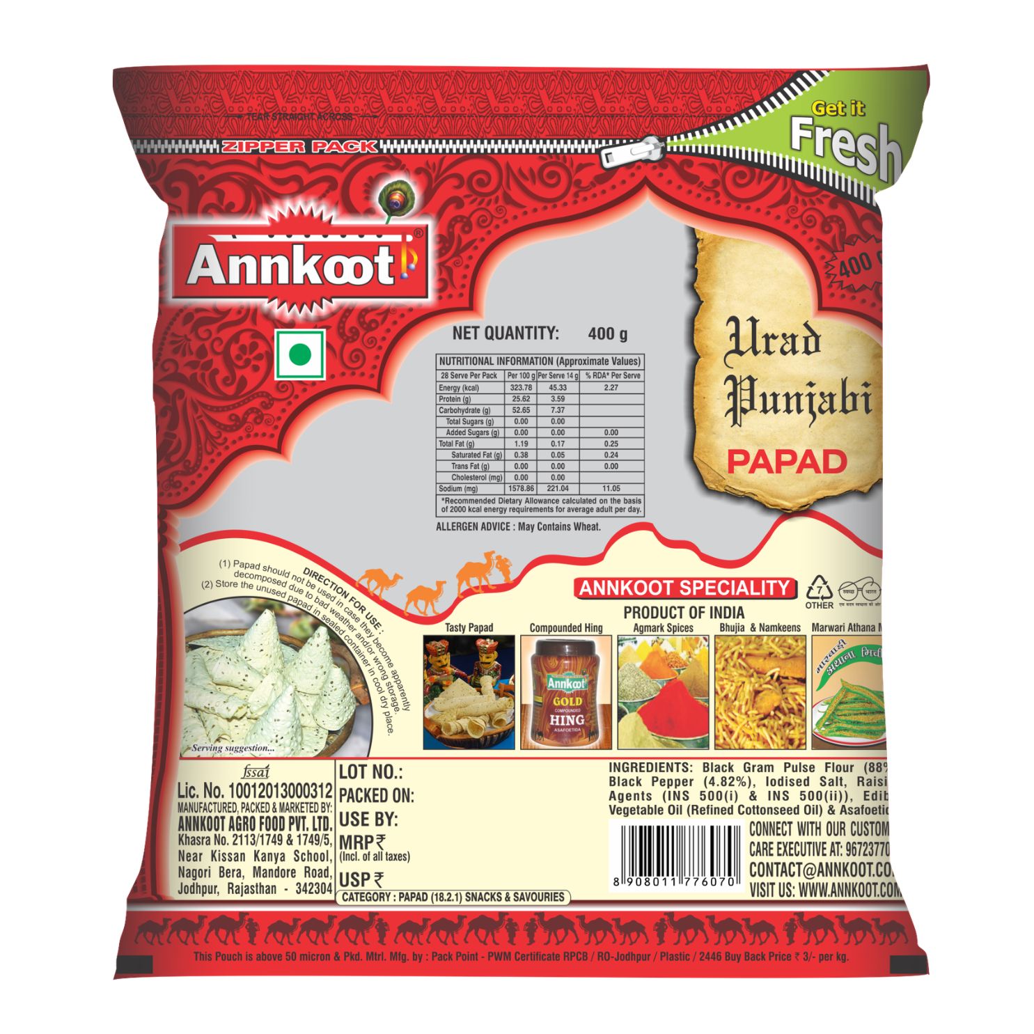 Annkoot Urad Punjabi Papad is a delightful fusion of tradition and taste, handcrafted with the finest urad dal and authentic spices. Each bite offers a satisfying crunch, releasing a burst of rich, peppery flavors that awaken the senses. The irresistible aroma of roasted lentils and hand-ground spices fills the air, evoking the warmth of home-cooked meals. Made with purity and love, just like a mother’s touch, these papads carry forward the legacy of traditional handmade techniques, ensuring an authentic taste that connects generations. Perfectly crispy and deeply flavorful, Annkoot Urad Punjabi Papad is a true celebration of heritage on every plate!