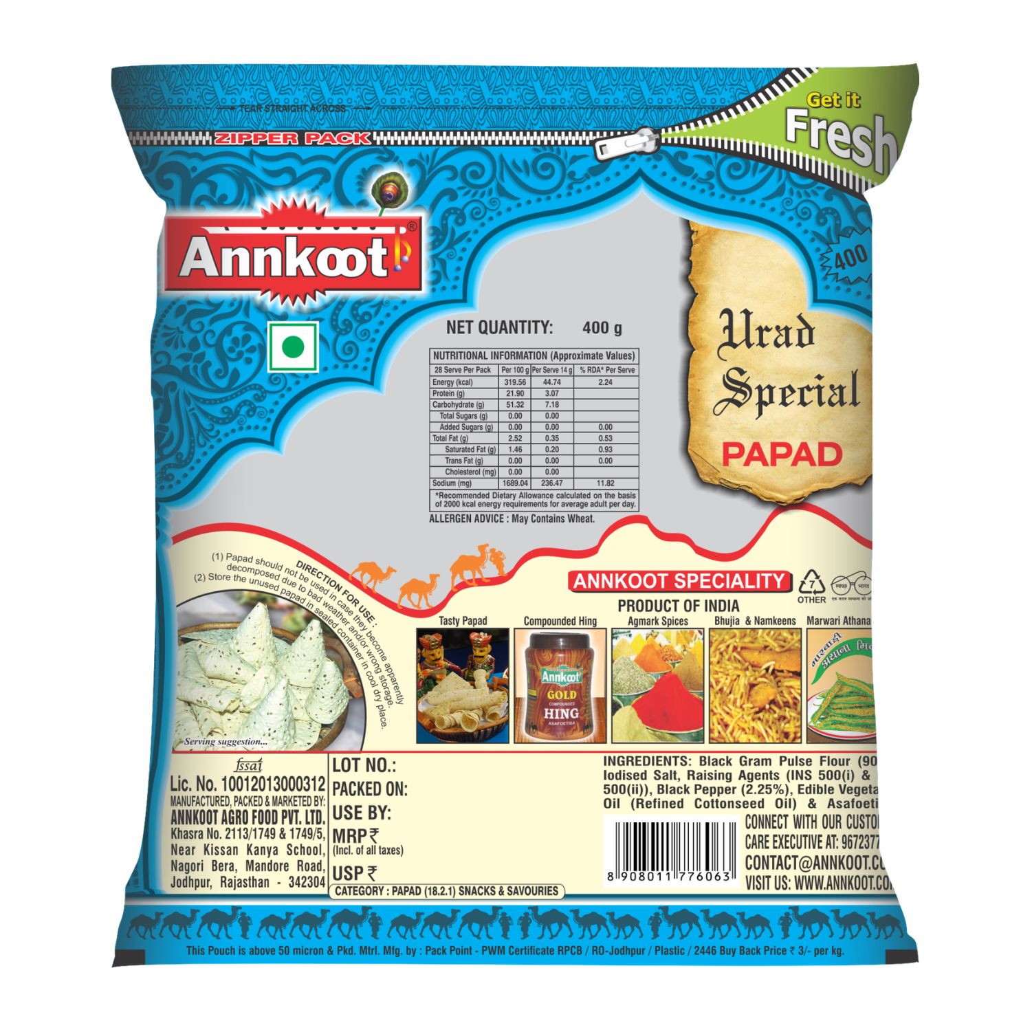 Annkoot Urad Special Papad is a delightful blend of tradition and taste, offering an irresistibly crispy and crunchy texture with every bite. Made from the finest urad dal, its rich aroma and authentic flavors reflect the purity of ingredients and the care of a mother’s love. Each papad is handcrafted using time-honored techniques, ensuring a perfect balance of spice and crispiness that enhances every meal. With its light, airy crunch and mouthwatering taste, Annkoot Urad Special Papad brings the warmth of homemade goodness to your plate.